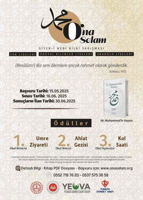 MEB, DİB, Yunus Emre Cami Vakfı ve Türkiye Diyanet Vakfı işbirliğiyle düzenlenen Siyer-i Nebi yarışmasında Macit Zeren Fen Lisesi öğrencisi 11-D sınıfından Gülçin TARHAN 100 soruda 98 doğru 1yanlış 1 boş ile İl birincisi olarak "Umre Ziyareti" ödülünü kazandı. Kendisini tebrik eder, başarılarının devamını dileriz.